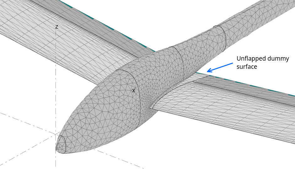 Special care should be taken to avoid panel intersections when setting flap angles. These may typically arise in adjacent wing panels with non-identical dihedral angles as illustrated in the image on the right.